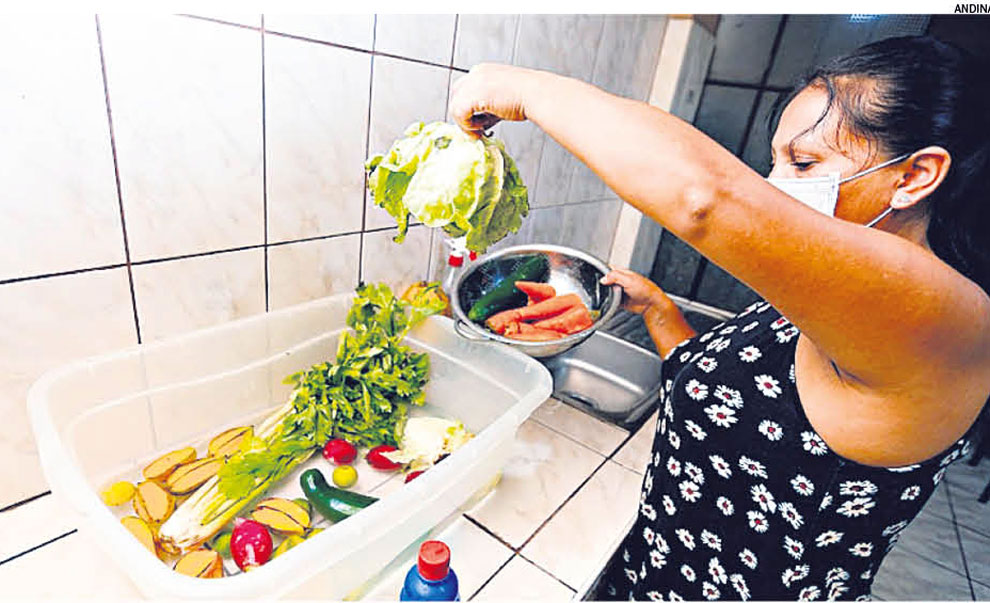 En el caso de frutas y verduras, se debe hacer un primer lavado lavado con agua y luego, la desinfección utilizando soluciones de agua, lejía, bicarbonato, vinagre, agua oxigenada, entre otros; así como mantener un frecuente lavado de manos, con agua y jabón antes de manipular los alimentos.