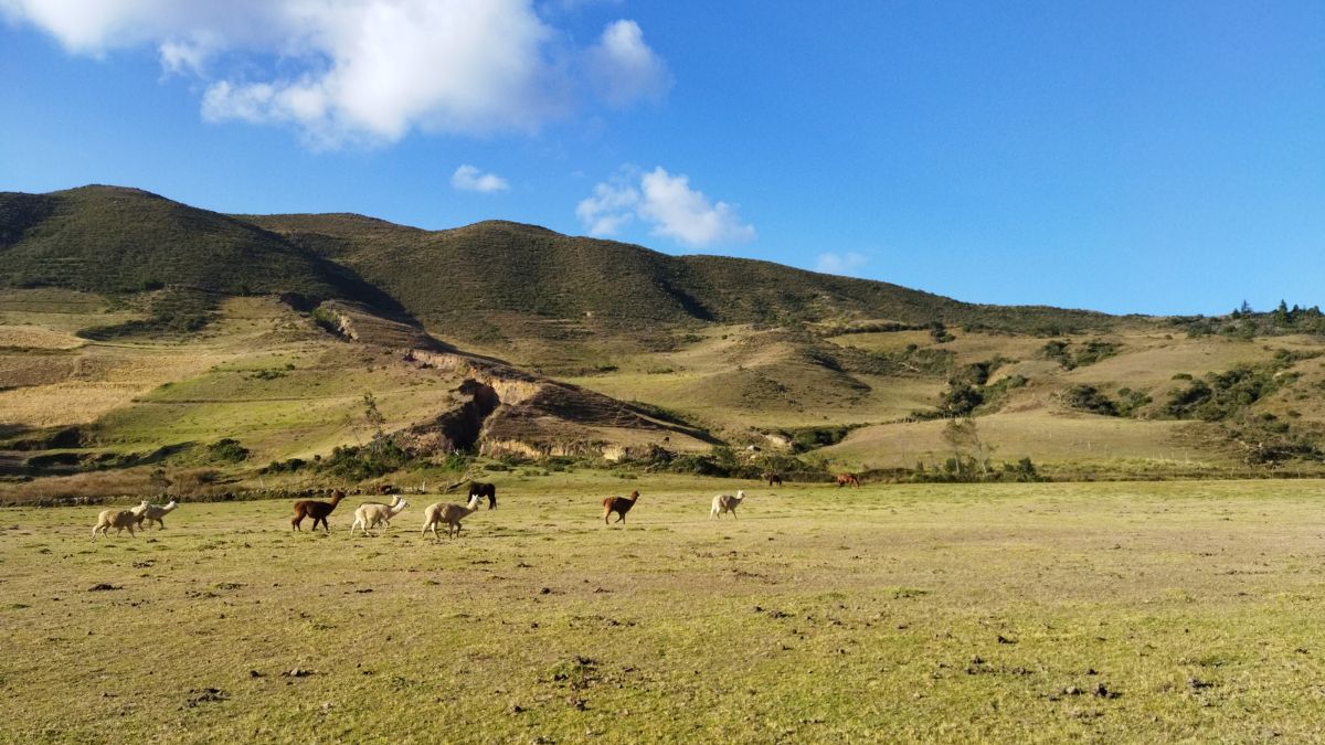 Sólo en esta zona se conserva la cría de alpacas que, según nos cuenta Crisálida Castillo Cango, muy conocedora de estos parajes, fueron traídas luego de una plaga que hace años arrasó con las ovejas en esta parte de la sierra. Al parecer se aclimataron y ahora las vemos formando parte del maravilloso paisaje de la Meseta Andina conformada por más de 20 centros poblados en una extensión de 230 kilómetros cuadrados, entre ellos el primer pueblito que nos recibe, Poclús.