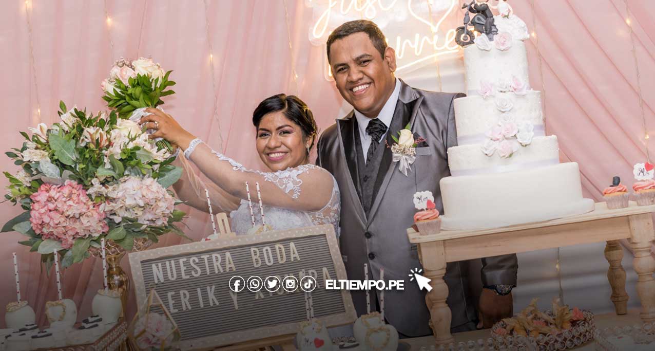 Erick Barrientos Queneche y Xiomara Codarlupo Espinoza posan felices en la recepción de su boda.
