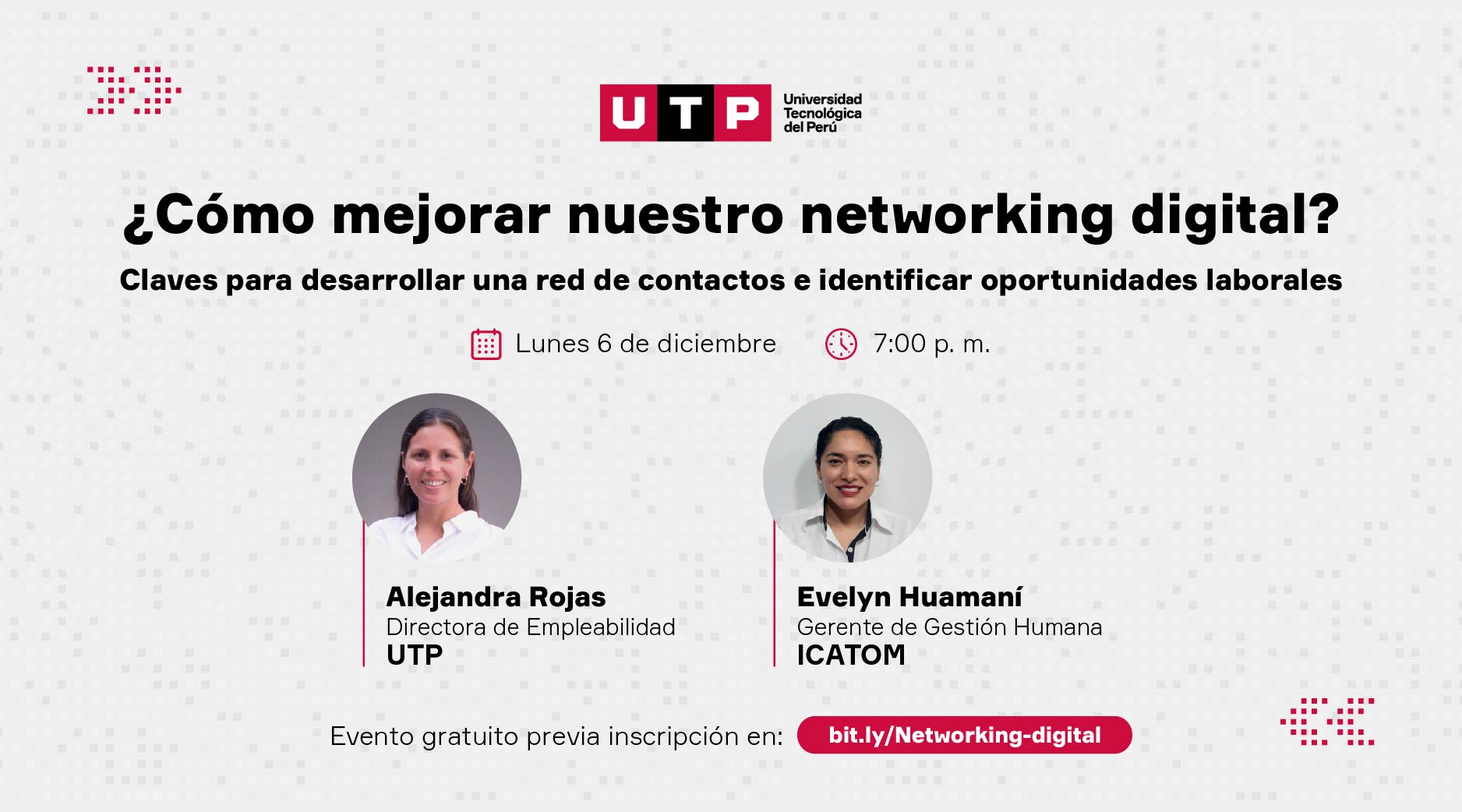 - El evento virtual gratuito, organizado por la UTP, se realizará el lunes 6 de diciembre, a las 7:00 p.m. Las inscripciones se pueden realizar en: https://bit.ly/Networking-digital