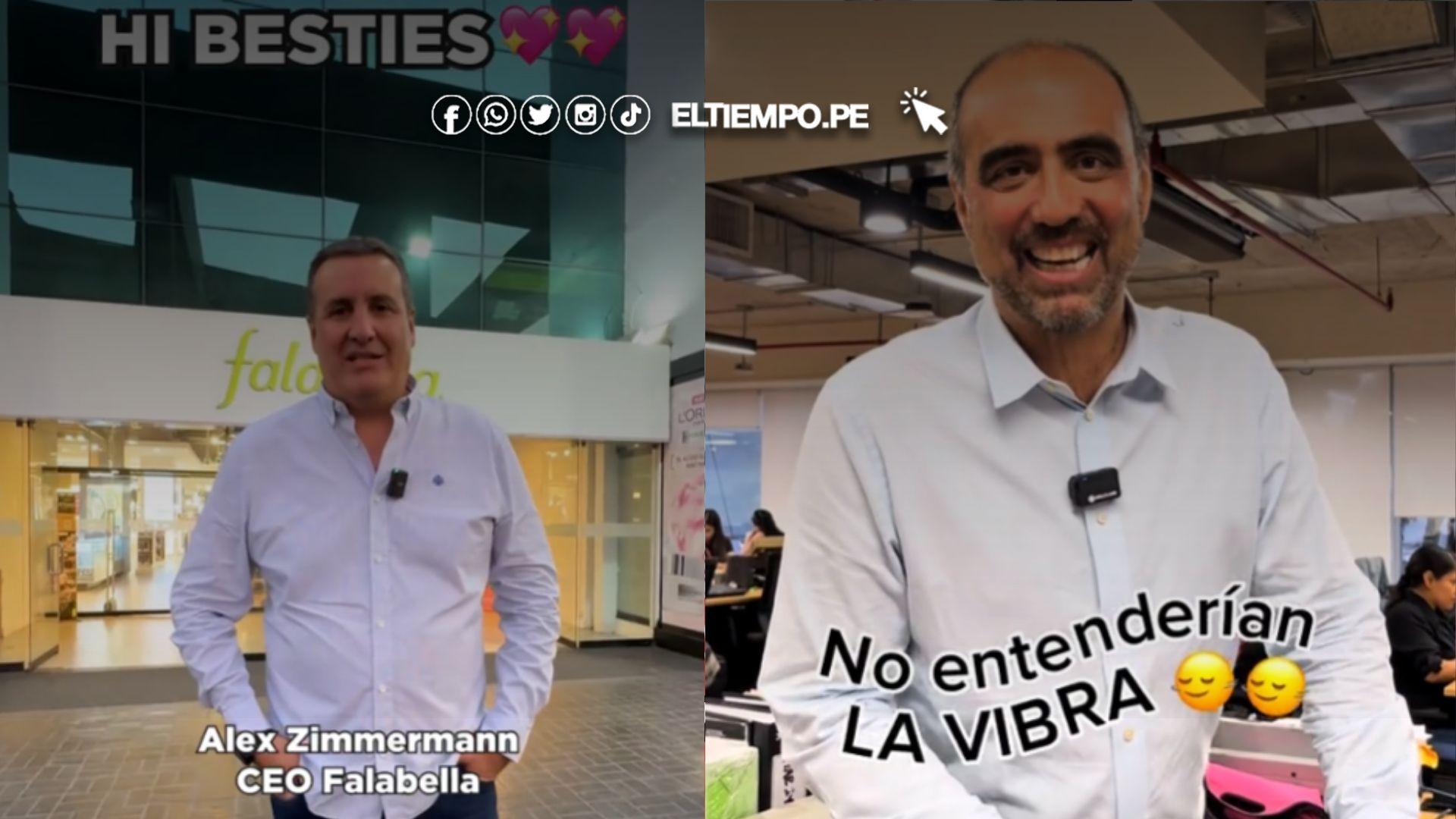 Alex Zimmermann, CEO de Falabella es el que más se ha posicionado en TikTok e Instagram, su video inicia con él equivocándose en el guion, el cual es redactado con las jergas más comunes hoy en día por la juventud peruana. «Hi Besties» es la frase con la que inicia este divertido video tour por una de las tiendas retail más importantes de Perú.