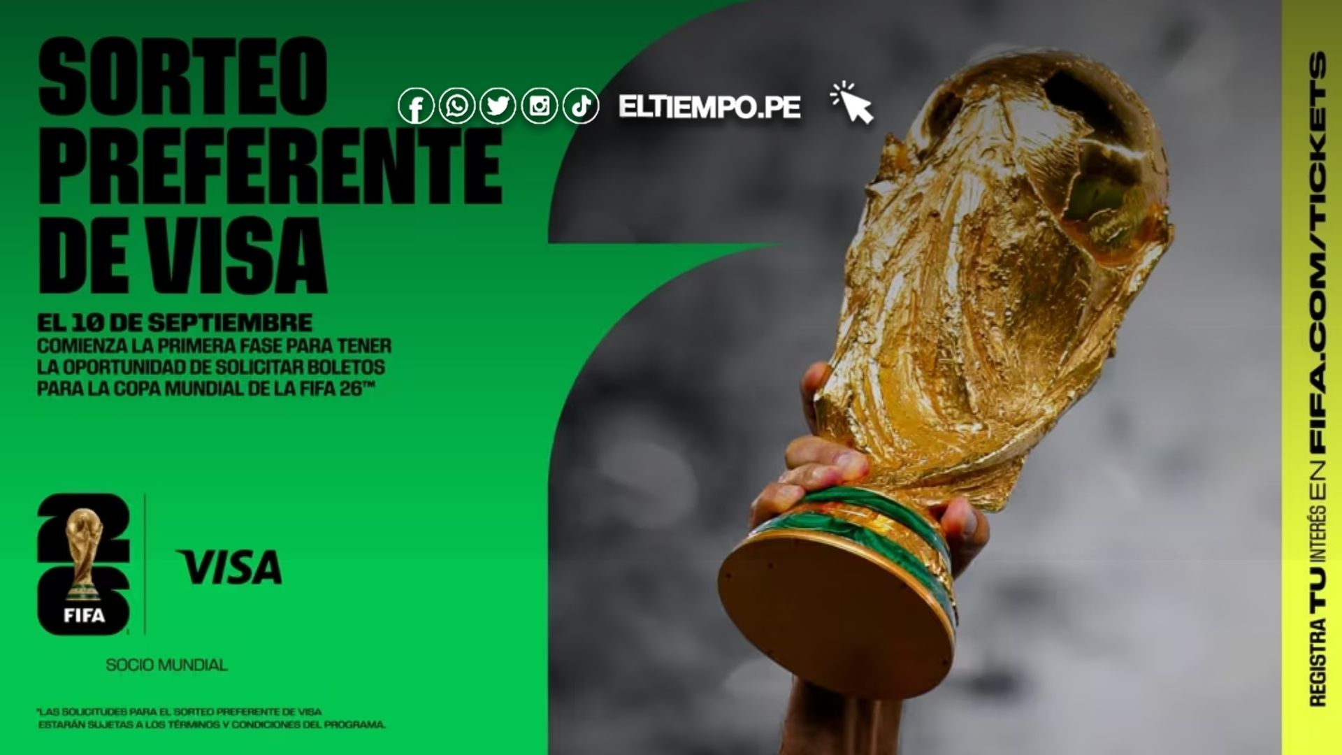 La cuenta regresiva para la Copa Mundial de la FIFA 2026™ ha comenzado, y con ella llega la primera gran oportunidad para que los fanáticos del fútbol aseguren su lugar en el torneo más esperado del planeta. A partir del miércoles 10 de septiembre, los titulares de tarjetas Visa de todo el mundo podrán registrar su interés para participar en el sorteo preferente de Visa y así acceder a la compra anticipada de entradas.