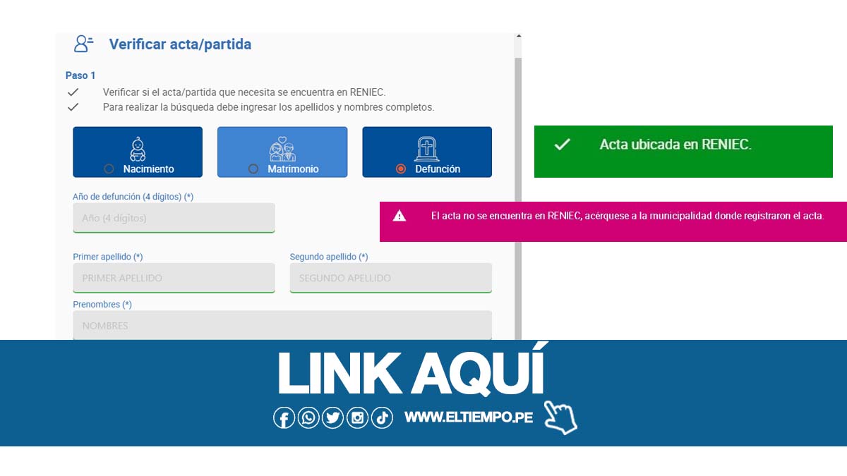 - Aquí podrás verificar tu acta o partida de nacimiento, matrimonio y defunción.