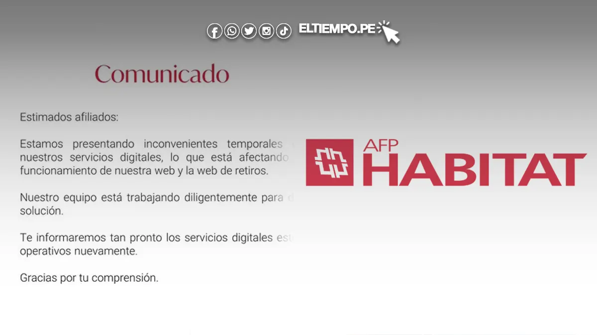 Según confirmó la misma administradora mediante un comunicado publicado en sus canales oficiales, la web de AFP Habitat y su plataforma de retiros están presentando “inconvenientes temporales” que impiden el correcto funcionamiento de los servicios digitales. El mensaje difundido señala que su equipo técnico se encuentra trabajando “diligentemente” para restablecer el acceso lo antes posible.